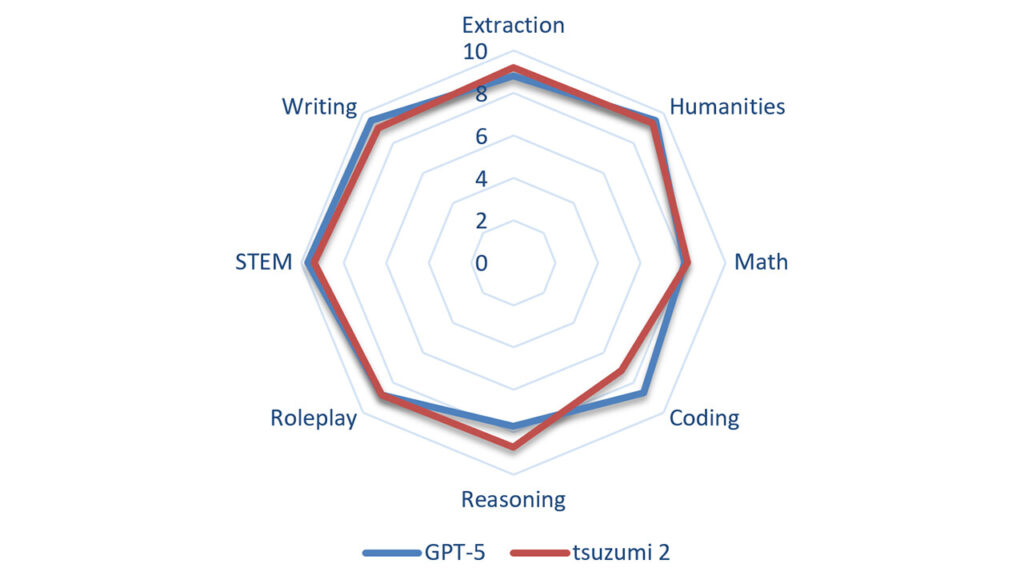 性能面では、代表的なベンチマークの1つであるMT-benchにおいて、GPT-5との比較で注目すべき結果を示しています。MT-benchは言語モデルの特性を多角的に評価するテストで、情報抽出、人文科学、数学、コーディング、推論、ロールプレイ、科学技術、ライティングという8つの分野で構成されています。tsuzumi 2はこれらほぼすべての分野でGPT-5と同等の数値を記録し、特定の用途に特化したモデルではなく、多様な要求に応えられる汎用性の高さを備えていることが証明されました。