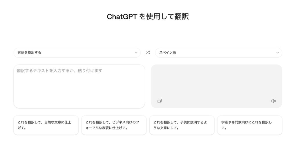 ChatGPT Translateは、OpenAIが提供する翻訳専用のWebサービスです。通常のChatGPTとは別ページで提供されており、会話形式ではなく、左右に分かれたシンプルな画面構成を採用しています。左側に原文を入力すると、右側に翻訳結果が表示される仕組みで、操作感は一般的な翻訳サービスと大きく変わりません。