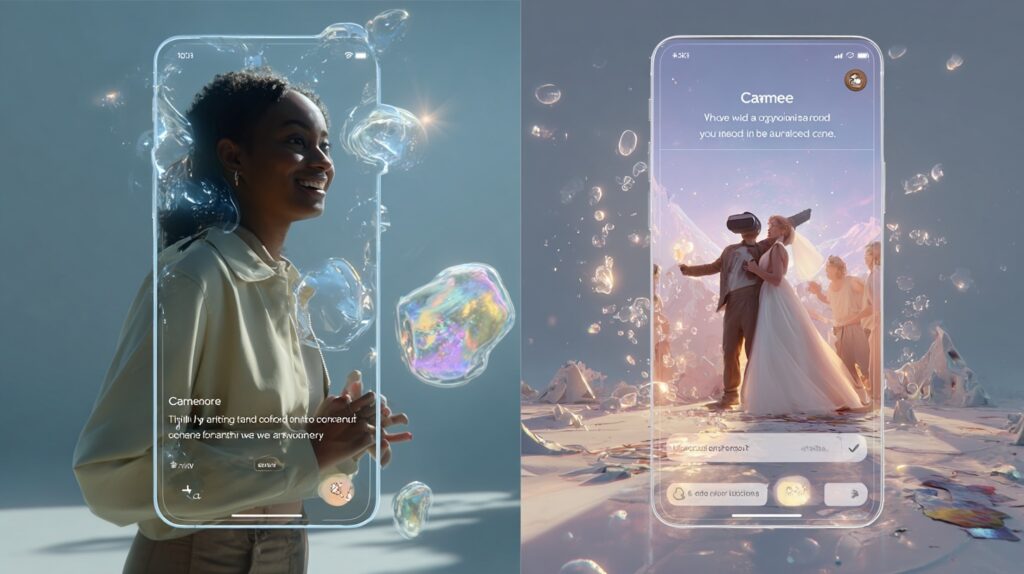 Sora 2と同時に発表されたのが、「Sora」という新しいiOSアプリです。ここで注目すべきは「カメオ」という機能でしょう。アプリで一度だけ自分の動画と声を録画すれば、その後はSoraが生成したどんなシーンにも自分を登場させられます。友人の結婚式で踊る自分、宇宙空間を漂う自分。すべて数タップで実現できるのです。