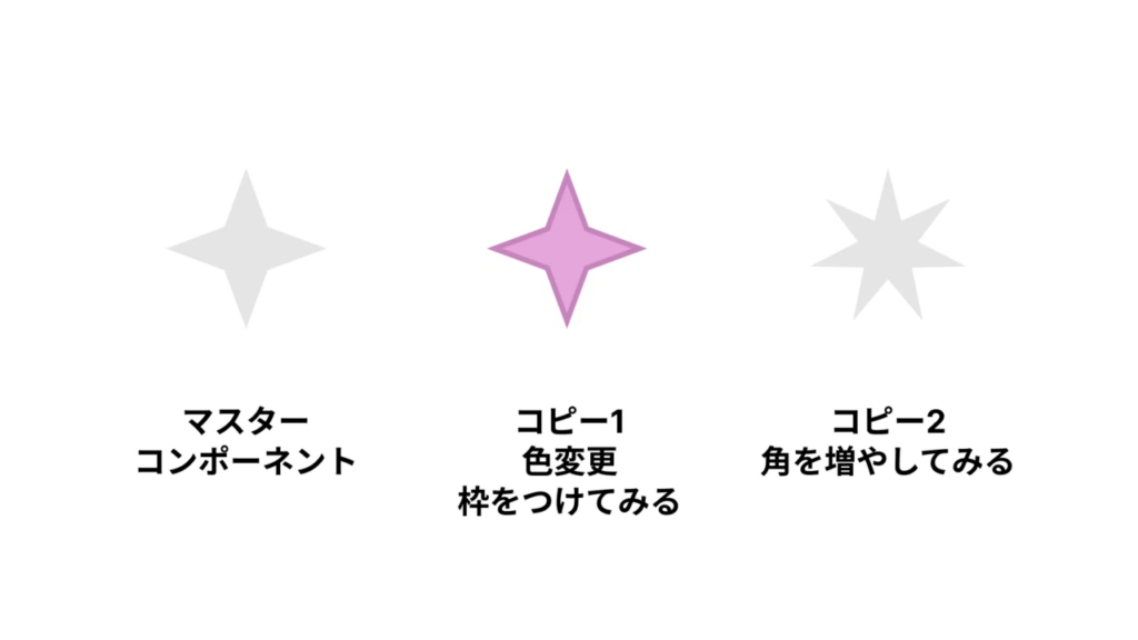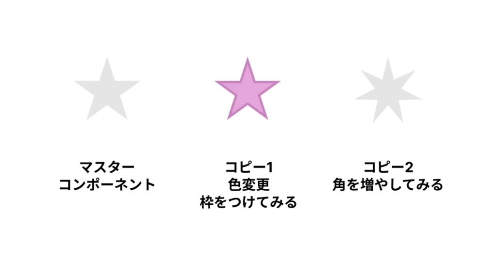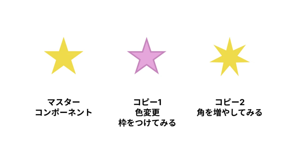 コンポーネントとはデザイン部品の再利用化を目的としたもので、エンジニアでいうところの「オーバーライド」の概念と同じようなものになります。画像で順を追って説明しますね。